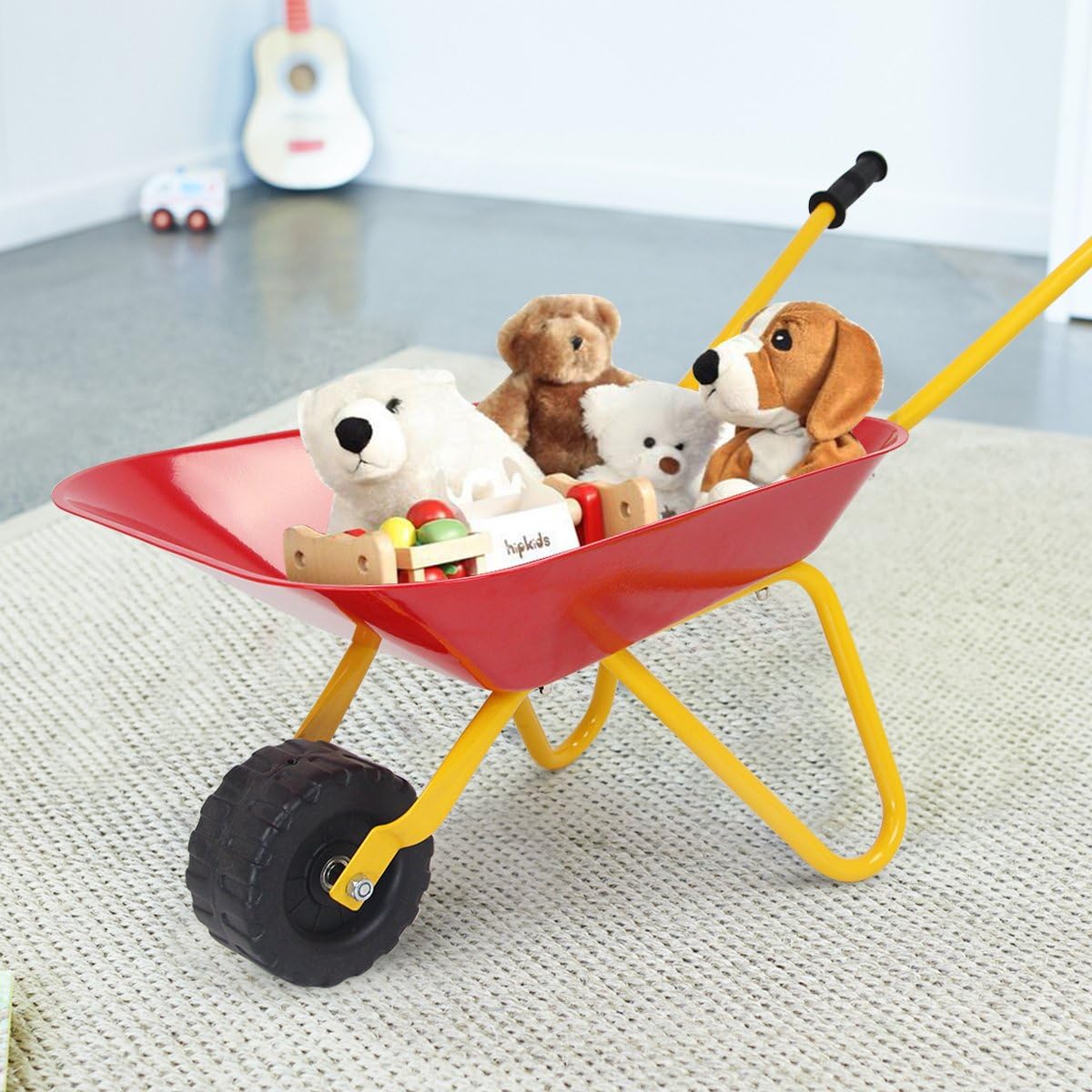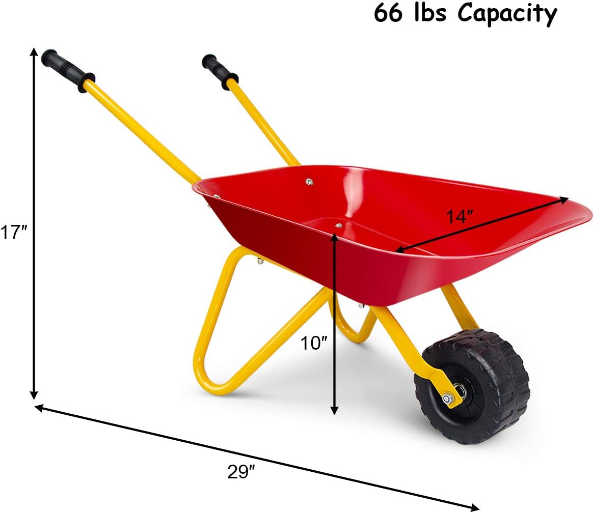 Description:Introducing our sturdy and reliable kids' wheelbarrow, this mini toy wagon is crafted from lightweight yet strong anti-rust carbon steel, capable of holding up to 66 pounds. Elevated by its pyramid structure with 2 rear feet, this toys kart ensures stability across various terrains like gardens, floors, and sand. Designed thoughtfully for toddlers aged 36 months and up, it features curved corners and an easy-unload design for safety and convenience. The ergonomically shaped, anti-slip handles provide fatigue relief and enhanced safety. This all-terrain kart serves as an ideal birthday or Christmas gift, encouraging outdoor play, exercise, and joy for your cherished child.Features:Crafted from anti-rust carbon steel, lightweight yet solidSupports up to 66 pounds, ideal for heavy loadsPyramid structure enhances stability, preventing tippingNonskid wheels adapt to various outdoor terrainsPP wheel material is lightweight and flexibleDimensions tailored for toddlers aged 36 months and upCurved tray corners ensure child safetyEasy-to-unload design for convenient useErgonomically designed handles reduce fatigueAnti-slip handles provide additional safetySpecifications:Color: Green / Light Green / RedMaterial: Carbon Steel + TPR + PPOverall Dimensions: 29” x 14” x 17” (L x W x H)Net Weight: 4.5 lbsWeight Capacity: 66 lbsRecommended Age: 3+ Years OldPackage Includes:1 x Kids Wheelbarrow1 x Assembly Instruction